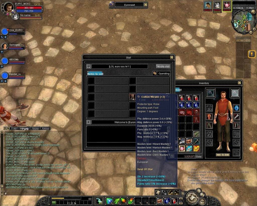 | Quote (MOKC) А ещё, постоянно зависает, при возврате в город после смерти... Приходится черех Дисетчер задач вырубать силку... -_- +1. В Итем Молл новые петы ! И вроде бы всё? Слоны и Страусы... Не пойму вот беру билет и тока в пати с ним качаться на 8-ых? Но он же не действует в пати на 8ы-х.Добавлено (2007-07-24, 7:28 Pm) --------------------------------------------- Народ помогите ...это издевательство ... немогу ни за ту рассу поиграть и ни за другую !!! Ото всех выбрасывает!!!!!!! Как качаться или вообще находится в мире?Это типо тока у тех у кого нету Премиума? Добавлено (2007-07-24, 8:02 Pm) --------------------------------------------- 3 минуты не могу продержаться в игре...
